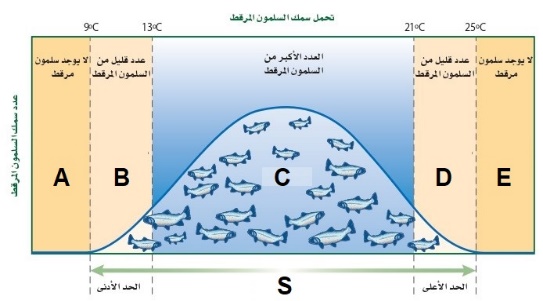 الشكل المقابل يصف تحمل أحد المخلوقات الحية "السلمون"، يمثل حرف(D) منطقة: