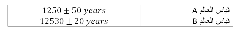 قام العالمان A و B بقياس عمر قطعة اثرية فكانت قراءتهما كالتالي اذا كان العمر الحقيقي للقطعة الأثرية يساوي أي العالمان قياسهما أكثر ضبطا ؟