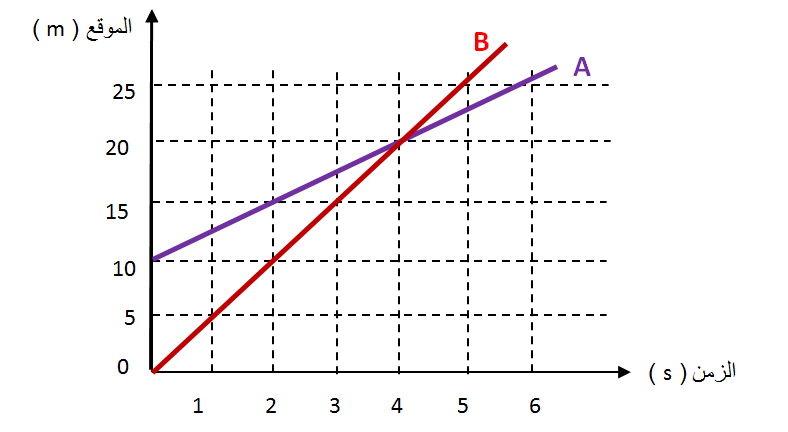 الشكل البياني المجاور يمثل العلاقة البيانية بين الموقع والزمن للعدائين A و Bمن أين بدأ العداء Aحركته ؟